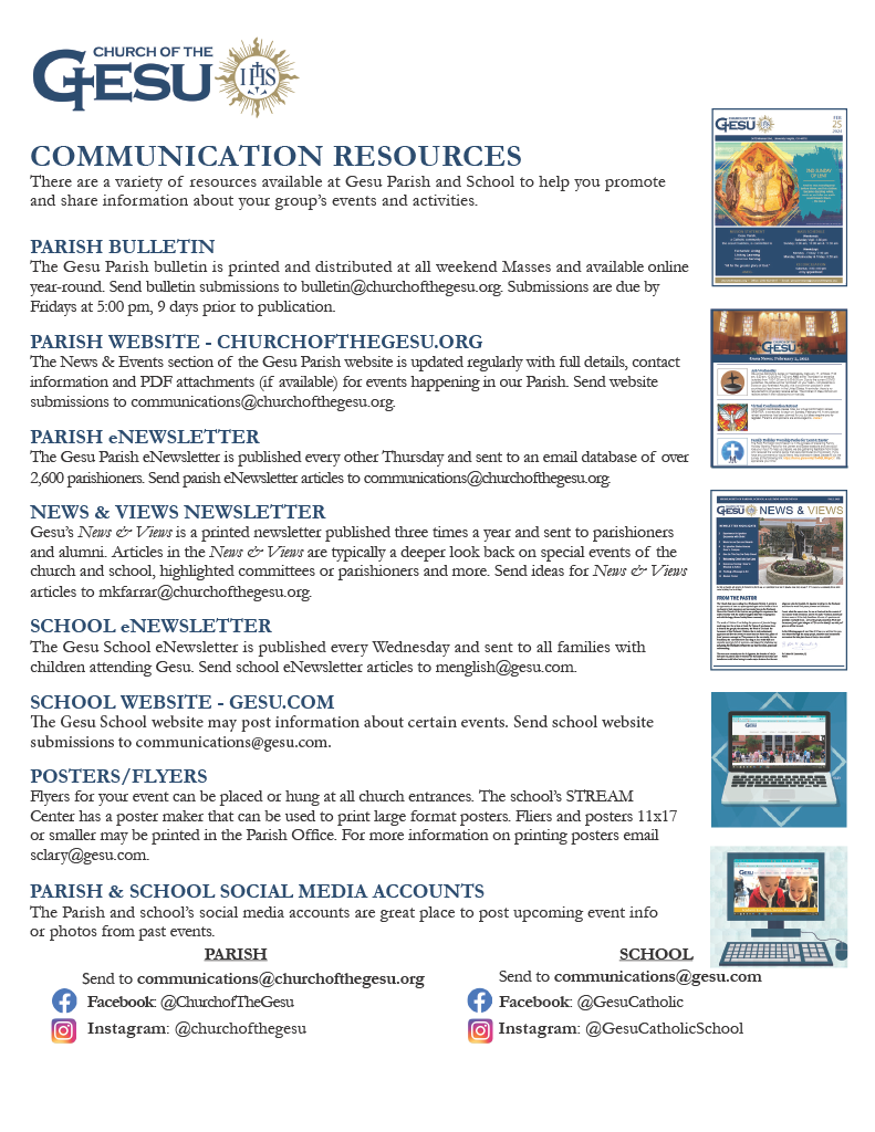 There are a variety of resources available at Gesu Parish and School to help you promote and share information about your group’s events and activities. For more information, please contact Meghan Svatora or Emily Davala.